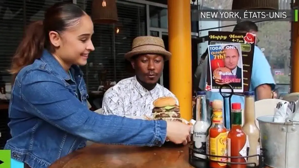 مشتری در حالی شروع به خوردن همبرگر میکند که روی میز تصویری از پوتین قرار گرفته که بر روی آن نوشته شده، "امروز 7 اکتبر روز تولد ولادمیر پوتین است؛ همبرگر پوتین بخورید."