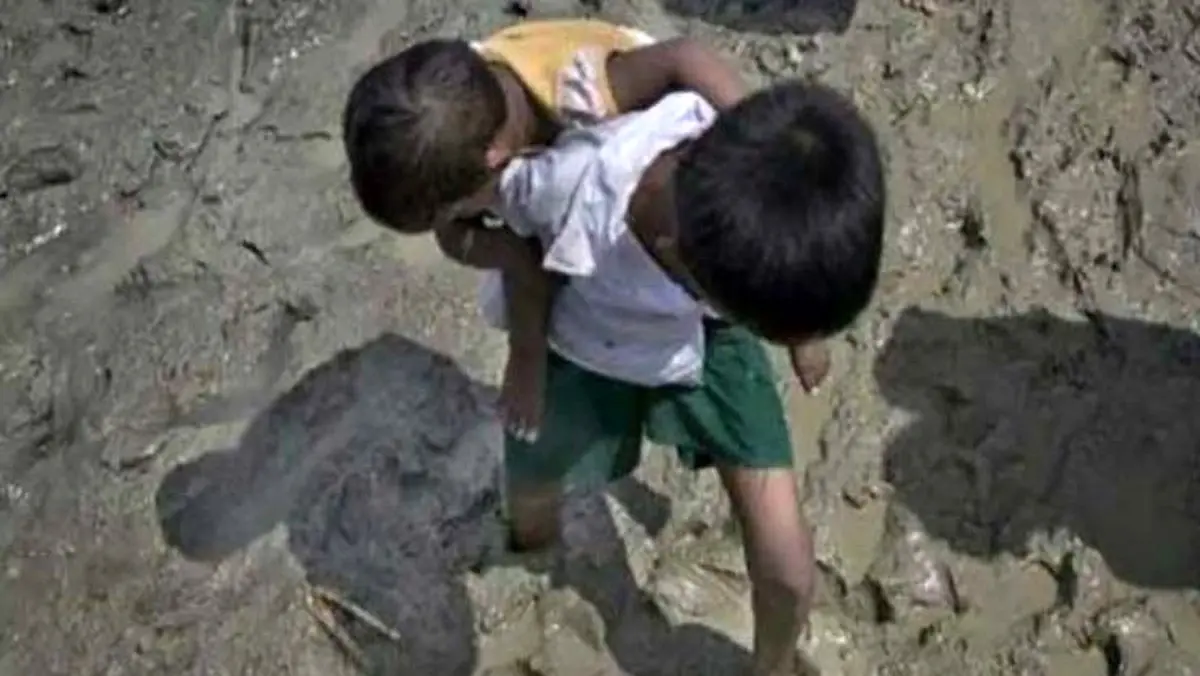 رکنا: کودک هفت ساله روهینگیایی با پای برهنه و درحالیکه خواهرش را روی پشتش حمل میکرد به بنگلادش رسید.