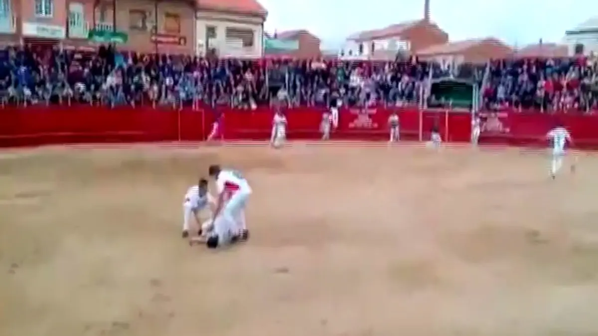 یک گاوباز اسپانیایی قصد داشت با پرش از روی گاوی که به سمت او حمله میکرد، مهارت خود را به نمایش بگذارد اما گاو وحشی با ضربه شاخ خود، این گاوباز را نقش بر زمین کرد. برای ورود به کانال تلگرام ما کلیک کنید.