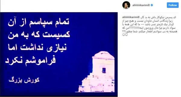 به گزارش گروه حوادث Accidents رکنا، علی کریمی در اینستاگرامی عکسی درباره کوروش منتشر کرده است که نوشته آن از شکسپیر است و شرح عکس مربوط به نامه ۳۱ نهجالبلاغه!برای ورود به کانال تلگرام ما کلیک کنید.