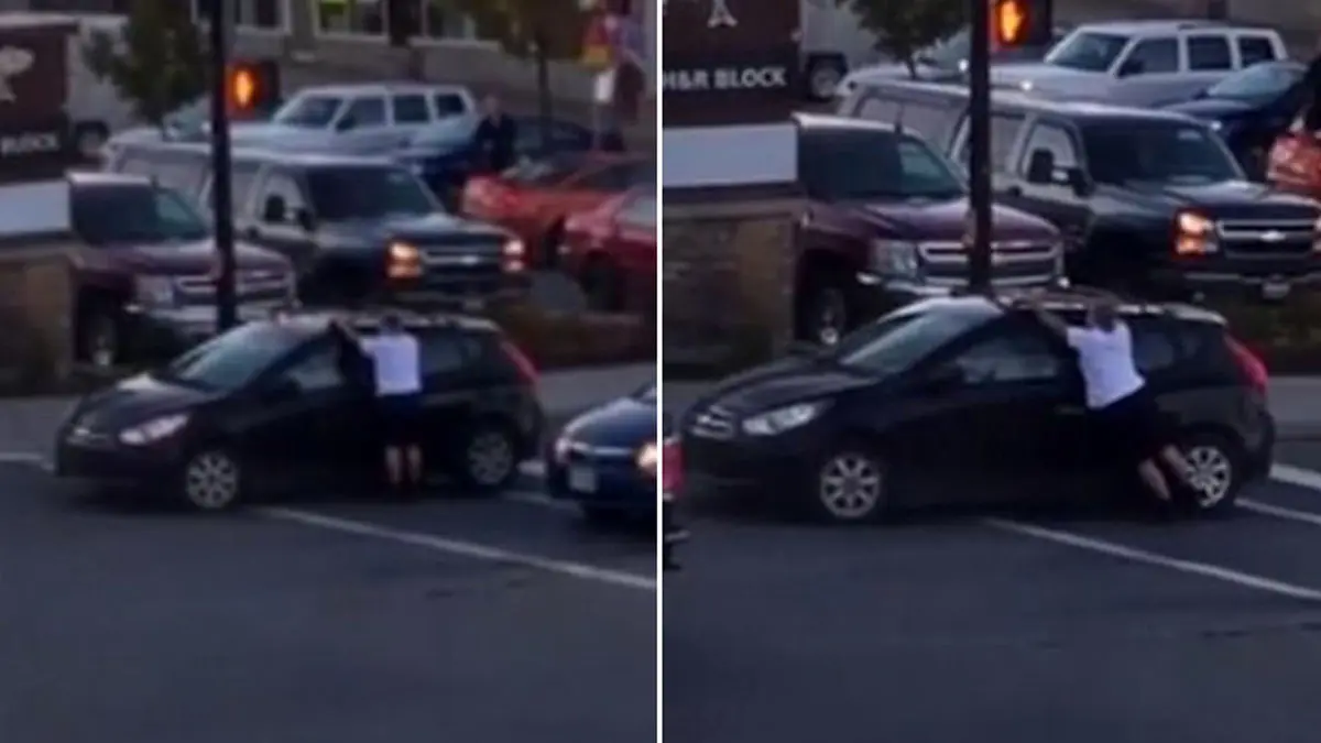 آویزان شدن خطرناک مردی از ماشینش که دزدیده شده بود + فیلم