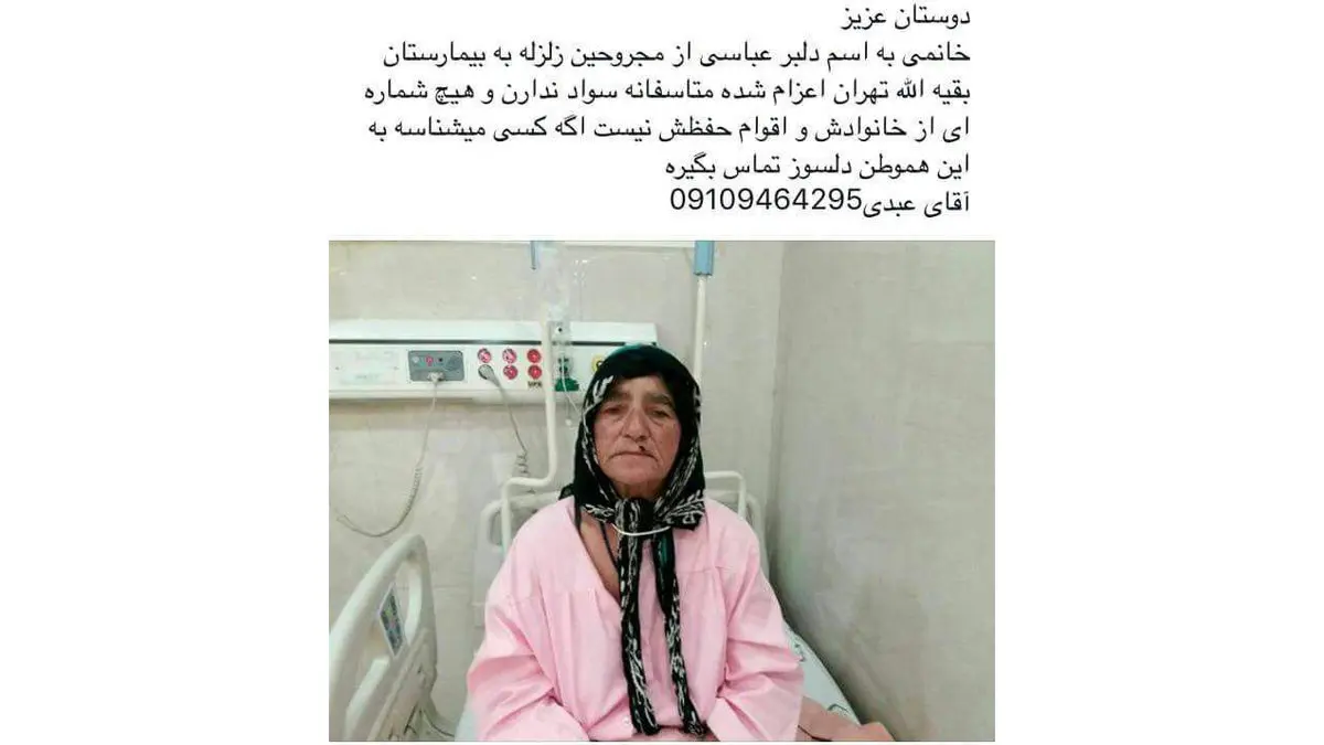 رکنا: این پیر زن در زلزله سرپل ذهاب گمشده است. او هنگامی که در بیمارستان به هوش آمده هیچ همراهی نداشته و سواد هم ندارد. اگر کسی او یا خانواده اش را می شناسید به پلیس خبر دهد.