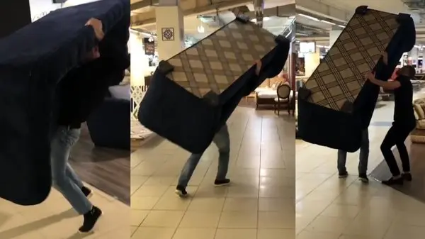 در یکی از شهرهای روسیه، سارقی وارد فروشگاه بزرگ مبلمان Furniture شد و در حرکتی ناشیانه اقدام به سرقت Stealing یک مبل بزرگ کرد.