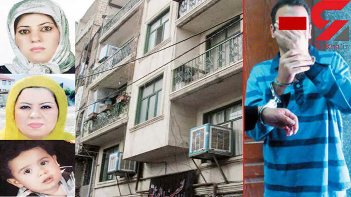 وقتی به خانهشان رفتم و ماجرا را به همسرش مینا گفتم او حرفهای نامربوطی زد. من هم او را هل دادم و با سیم سشوار خفهاش کردم. میخواستم از خانه خارج شوم که از پنجره یک زن را دیدم که وارد ساختمان شد. من النگوهای مینا را از دستش بیرون آوردم و سه تراول چکی را که در خانه بود برداشتم تا موضوع قتل، سرقت Stealing جلوه داده شود. در خانه را باز کردم تا فرار Escape کنم اما همزمان در واحد روبه رویی که خانه مادر مهدی بود باز شد و مادرش حلیمه از در بیرون آمد. او که از سالها پیش مرا میشناخت مرا به داخل آپارتمانش دعوت کرد.ولی به دروغ گفتم همسرم نزد میناست و دنبال او آمدهام. ولی یکباره به موضوع مشکوک شد. او میخواست به خانه عروسش برود که با گلدان به سرش کوبیدم و با چاقو او را هم کشتم. همان موقع پسر 8ساله مینا و مهدی از مدرسه به خانه بازگشته بود که در زد. در را که باز کردم از پشت، سر علیرضا را گرفتم و او را به اتاق خواب مادربزرگش بردم اما داخل اتاق خواب آینه بزرگی بود که ناگهان تصویر مرا دید و مجبور شدم او را هم با چاقو بکشم.»