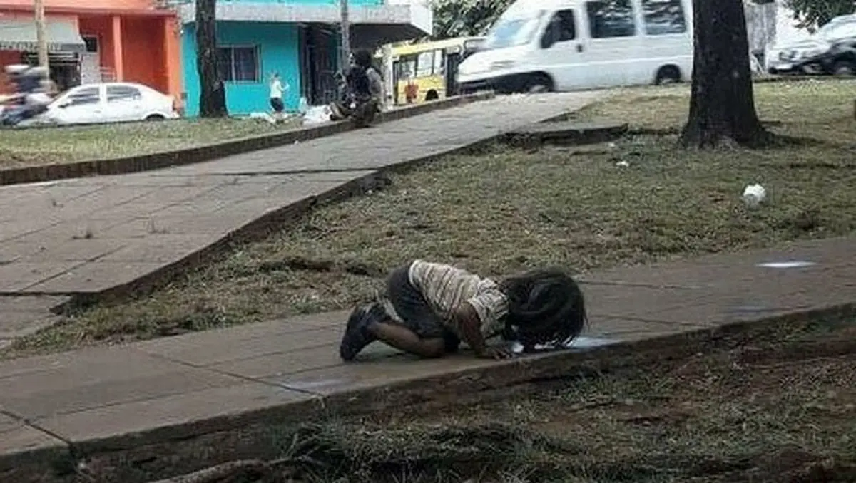 این تصویر توسط کارمندی ثبت شد که در حال گذر از خیابان بود. او حین خروج از محل کارش متوجه صحنه‌ بسیار دردناکی شد. دختربچه 3 یا 4 ساله‌ای که از شدت فقر و تشنگی روی دو زانویش خم شده و آب فاضلابی که روی زمین ریخته بود را می‌نوشید.