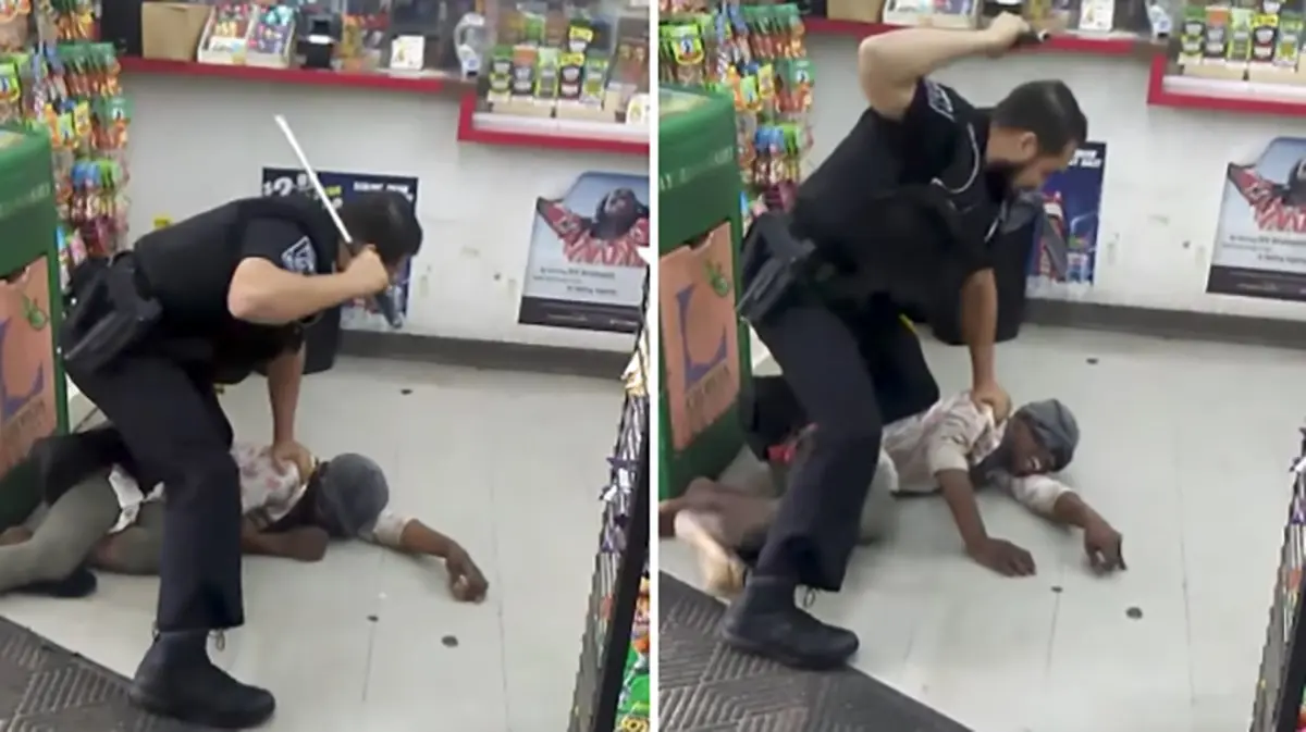 یک مامور پلیس Police آمریکا، زنی بی خانمان را در داخل یک فروشگاه مورد ضرب و شتم قرار داده است.