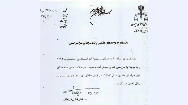 صادق آملی لاریجانی در بخشنامهای به واحدهای قضایی و دادسراهای کشور اعلام کرده است: در اجرای ماده 549 قانون Lawمجازات اسلامی مصوب 1392 و با توجه به بررسیهای به عمل آمده، قیمت دیه کامل در ماههای غیرحرام از ابتدای سال 1397 مبلغ دو میلیارد و سیصد و ده میلیون ریال تعیین شد.برای ورود به کانال تلگرام ما کلیک کنید.
