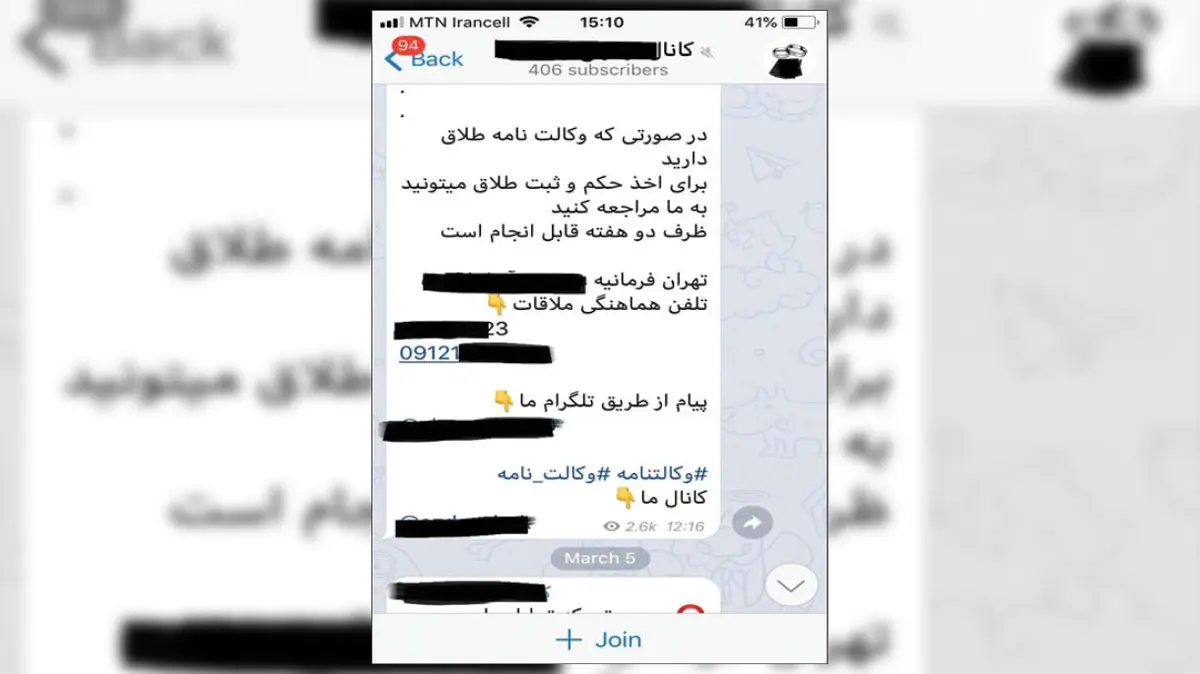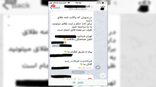 مؤسسات حقوقی که در تبلیغات خود در کانالهای تلگرامی شرایط طلاق بدون حضور طرفین در دادگاه را اعلام میکنند، حتی راهکارهایی را نشان میدهند که نه به معنای مشاوره برای بازگشت به زندگی بلکه راهی برای تسریع در طلاق است.