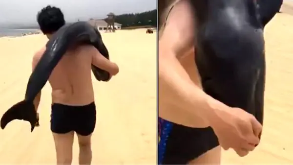 حوادث رکنا: در چین مردی که در یک ویدیو، دلفینی را به دوش انداخته و از ساحل دور میشود، تحت تعقیب پلیس شهر گوانگدونگ قرار گرفته است.