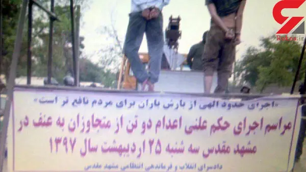 ٥ متهم درحالی پای میز محاکمه ایستادند که حکم اعدام execution برای دو متهم ردیف اول صادر و پس از تأیید به‌ منظور پیشگیری از وقوع جرایم احتمالی، این حکم به دستور قاضی Judge غلامعلی صادقی دادستان مشهد در ملأعام انجام شد.
