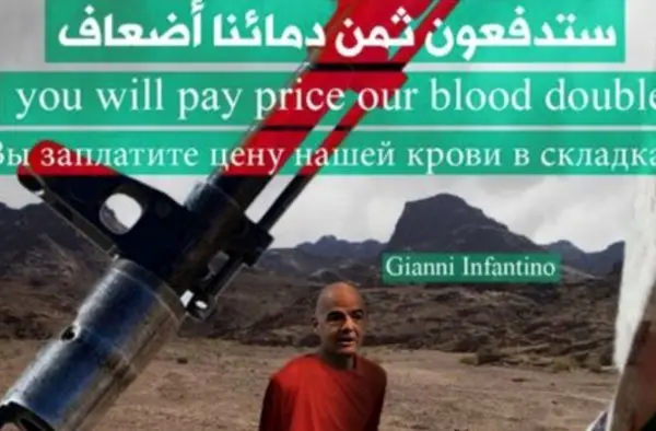 به گزارش گروه حوادث Accidents رکنا، عناصر گروه تروریستی داعش ISIS با انتشار یک پوستر «جانی اینفانتینو»، رئیس فیفا و دبیرکل سابق یوفا را تهدید کردند. در این پوستر تهدیدآمیز «جانی اینفانتینو» یک لباس نارنجی رنگ بر تن کرده است. در مقابل او یک تروریست Terrorist داعشی ایستاده است و یک مسلسل در دست دارد. روی این پوستر نوشته شده است: شما بهای خون ما را دو برابر پرداخت خواهید کرد.
