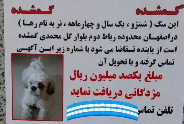 به گزارش گروه حوادث Accidents رکنا، به تازگی آگهی گمشدن یک سگ خانگی در اصفهان و مژدگانی ده میلیون تومانی برای یابنده آن گذاشته شده است.