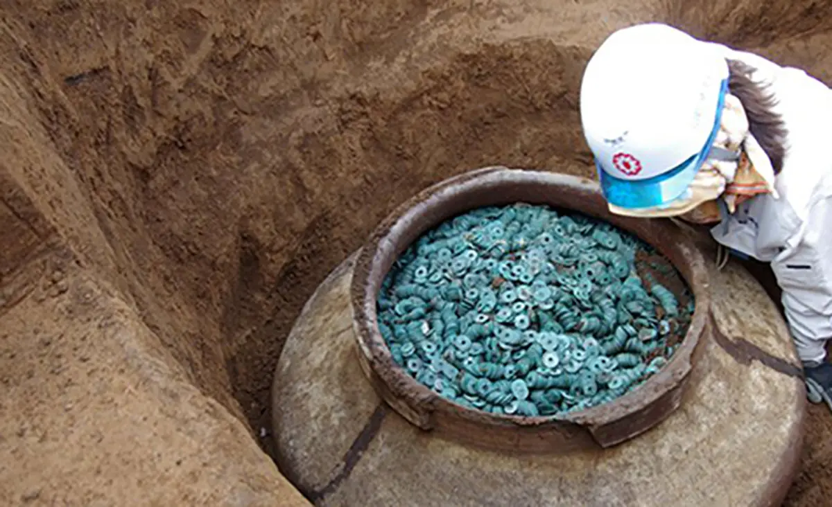 در حال حاضر ۷۰ سکه بررسی شده اند. آنها شامل ۱۹ سکه مختلف از چین و مناطق مختلف ژاپن میشوند. تصور میشود که همه سکهها (که وسطشان سوراخ است) قبل از ریختن در کوزه به نخ کشیده شده باشند.