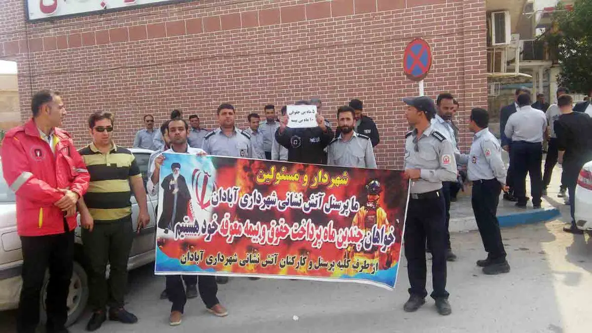 ادامه تجمع اعتراض آمیز آتش نشانان آبادانی برای دریافت طلبشان از شهرداری +عکس و فیلم