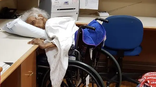 عکس منتشر شده حاکی از آن است که یک پیرزن 80 ساله و فرتوت در حالی که روی ویلچر نشسته و بیحال شده پرستاران با گذاشتن یک بالش روی میز سر بیمار بیچاره را روی بالش انداختند و رهایش کردند.