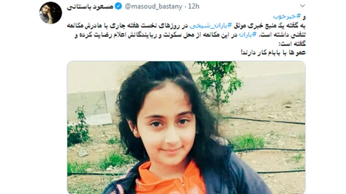 مسعود باستانی، خبرنگار حوزه اجتماعی درباره آخرین تحولات، در توئیتر نوشت: «خواهر وی در گفتوگویی به شدت از مسئولین و شایعهسازان فضای مجازی انتقاد کرد. او با بیان اینکه باران کوچکترین عضو خانواده است تأکید کرد: پدرم کشاورز است و نه خلافکار!