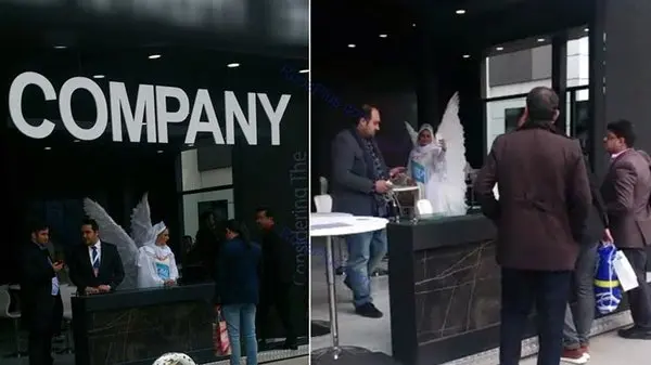 رکنا: یک خانم با پوشش و حرکات عجیب در حال جذب مشتری و جلب توجه آنها به محصولات یک شرکت تولید محصولات بهداشتی است.