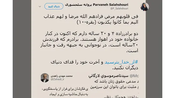 خانم سلحشوری با به اشتراک گذاشتن توییت دو عضو اصولگرای مجلس که شایعه دربارهی برادرزادهی او را دامن زده بودند، در توییتر نوشت:
