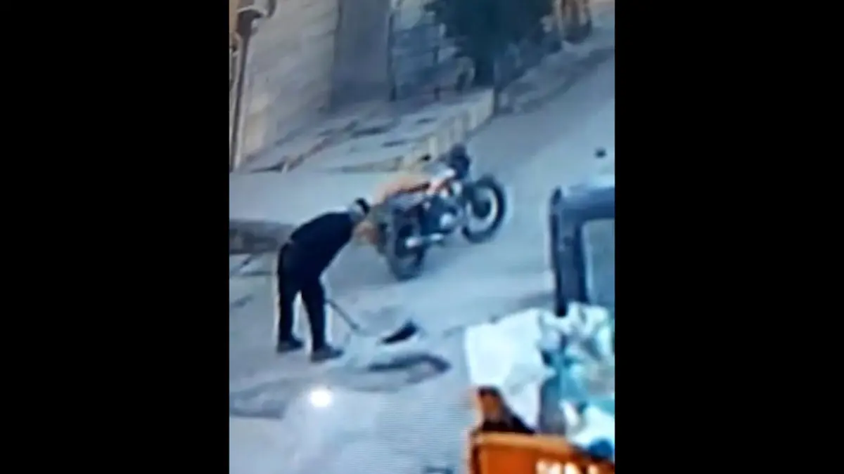 سارق خونسرد سوار بر موتور سیکلت در خیابان های خلوت آبادان دست به سرقت دریچه های فاضلاب می زند.