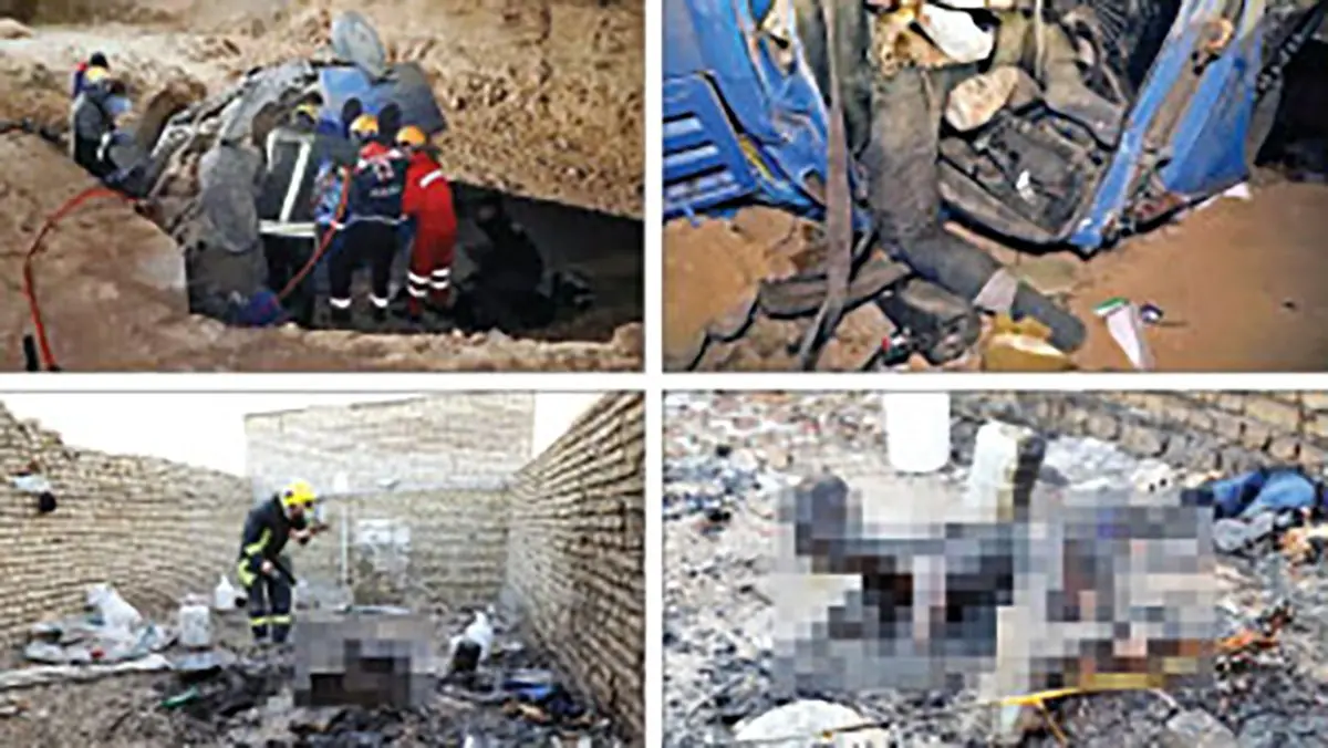 بررسیهای میدانی نشان داد که محل سقوط خودرو 2متر پایینتر از سطح جاده است و این خودرو به صورت واژگون درون گودالی سقوط کرده است.