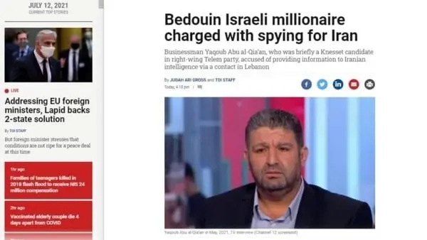 یعقوب ابوالعیقان که مدت کوتاهی هم نامزد عضویت کنست (پارلمان) از حزب راستگرای تِلِم بود، متهم است که بواسطه یک رابط لبنانی، اطلاعاتی را در اختیار ایران گذاشته است.