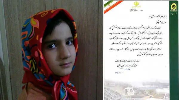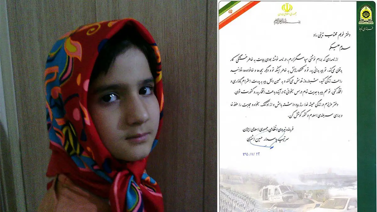 رکنا: فرمانده نیروی انتظامی جمهوری اسلامی ایران پاسخ زیبایی برای نامه دختر 8 ساله یکی از ماموران پلیس فرستاد. این نامه در پاسخ نامه پر احساس مهتاب تدینی راد خطاب به سردار اشتری نوشته شد.