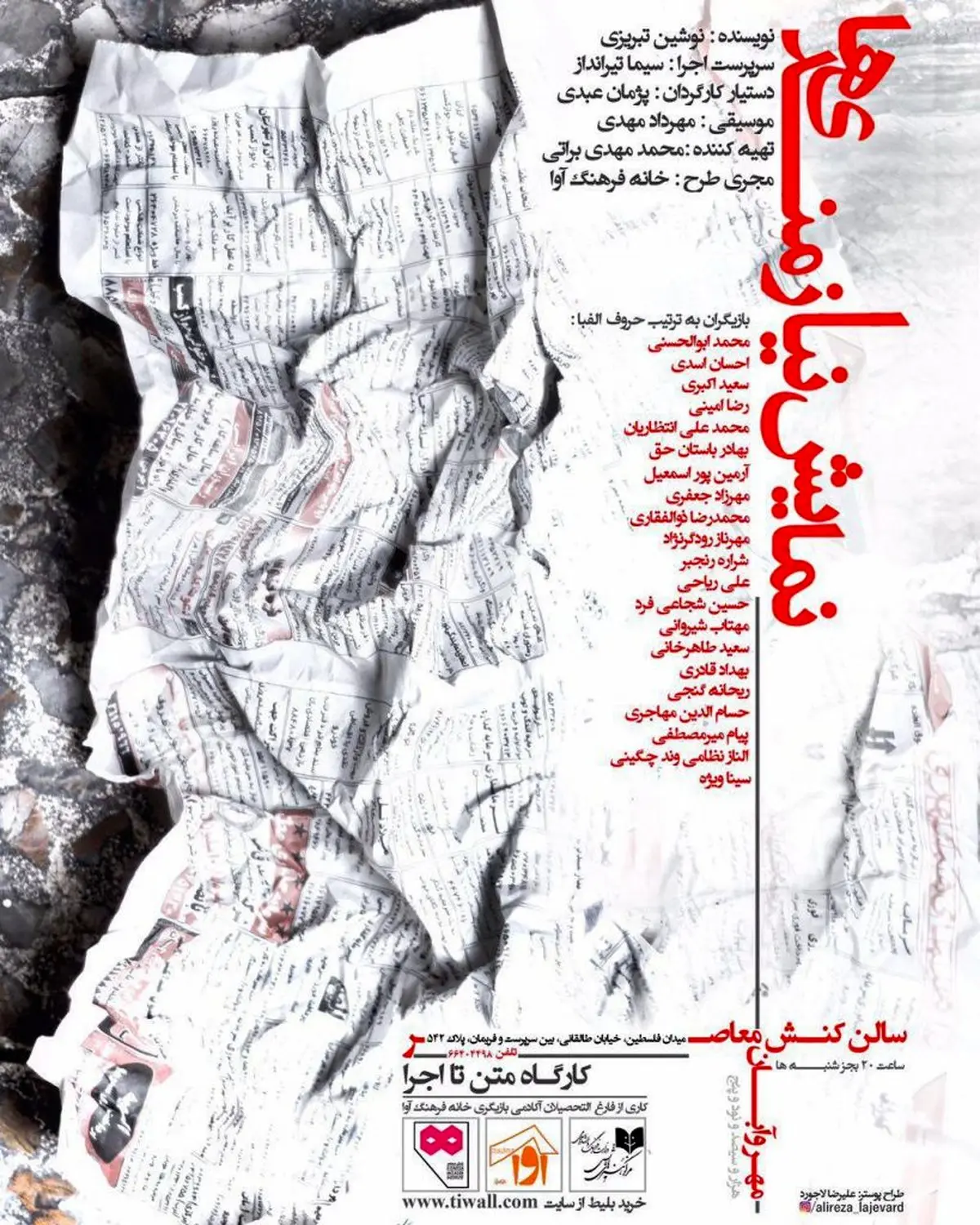 مجری طرح و تبلیغات نمایش «نیازمندی ها» خانه فرهنگ آواست . سالن کنش معاصر در میدان فلسطین-خیابان طالقانی-بین سرپرست و فریمان از ۲۱ آبان ماه پذیرای علاقه مندان این نمایش است.برای ورود به کانال تلگرام ما کلیک کنید.