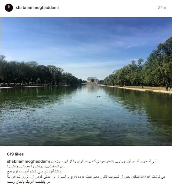 شبنم مقدمی بازیگر Actor فیلم‌های چون «ابدویک روز»، «نفس»‌ و «به نام پدر» عکسی از بنای یادبود لینکلن منتشر کرد و درباره او نوشت: «آبیِ آسمان و آب و آن دورتر. یادمان مردی که برده داری را از این سرزمین، برانداخت. و بهایش را هم داد. جانش را.