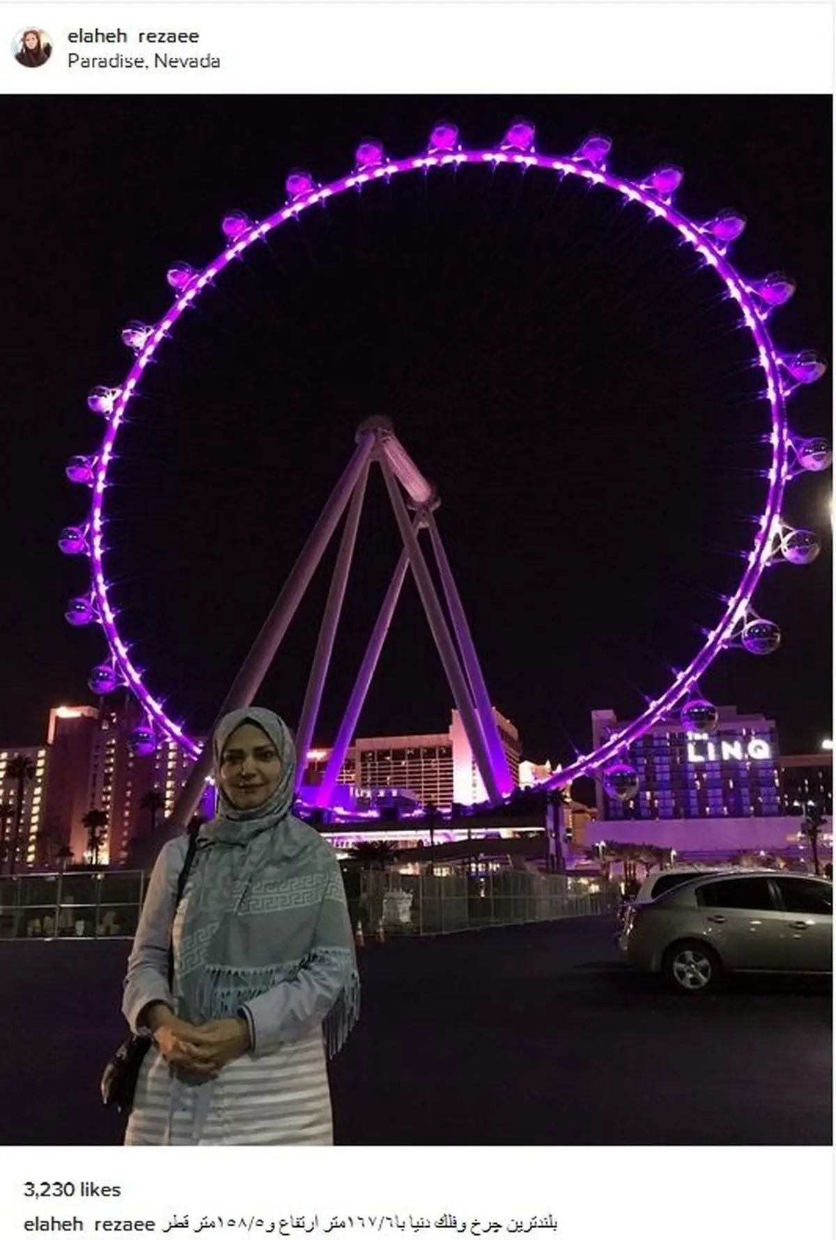 الهه رضایی عکسی از خود در کنار بلندترین چرخ و فلک جهان در کشور آمریکا منتشر کرد