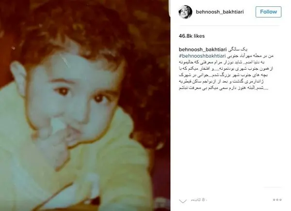 او در این باره نوشت: «یک سالگی من. در محله مهرآباد جنوبی به دنیا امدم، شاید دوزار مرام معرفتی که حالیمونه ازهمون جنوب شهری بودنمونه و افتخار میکنم که با بچههای جنوب شهر بزرگ شدم. جوانی در شهرک ژاندارمری گذشت و بعد از ازدواجم ساکن قیطریه شدم. البته هنوز دارم سعی میکنم بی معرفت نباشم.»برای ورود به کانال تلگرام ما کلیک کنید.