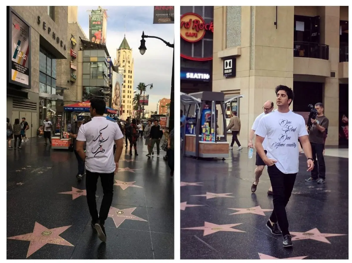 رکنا: فرزاد فرزین با قدم زدن در پیادهروی مشاهیر هالیوود پیراهنی بر تن کرد که بر رویش عنوانِ «خدا یکی، وطن یکی» نقش بسته است.
