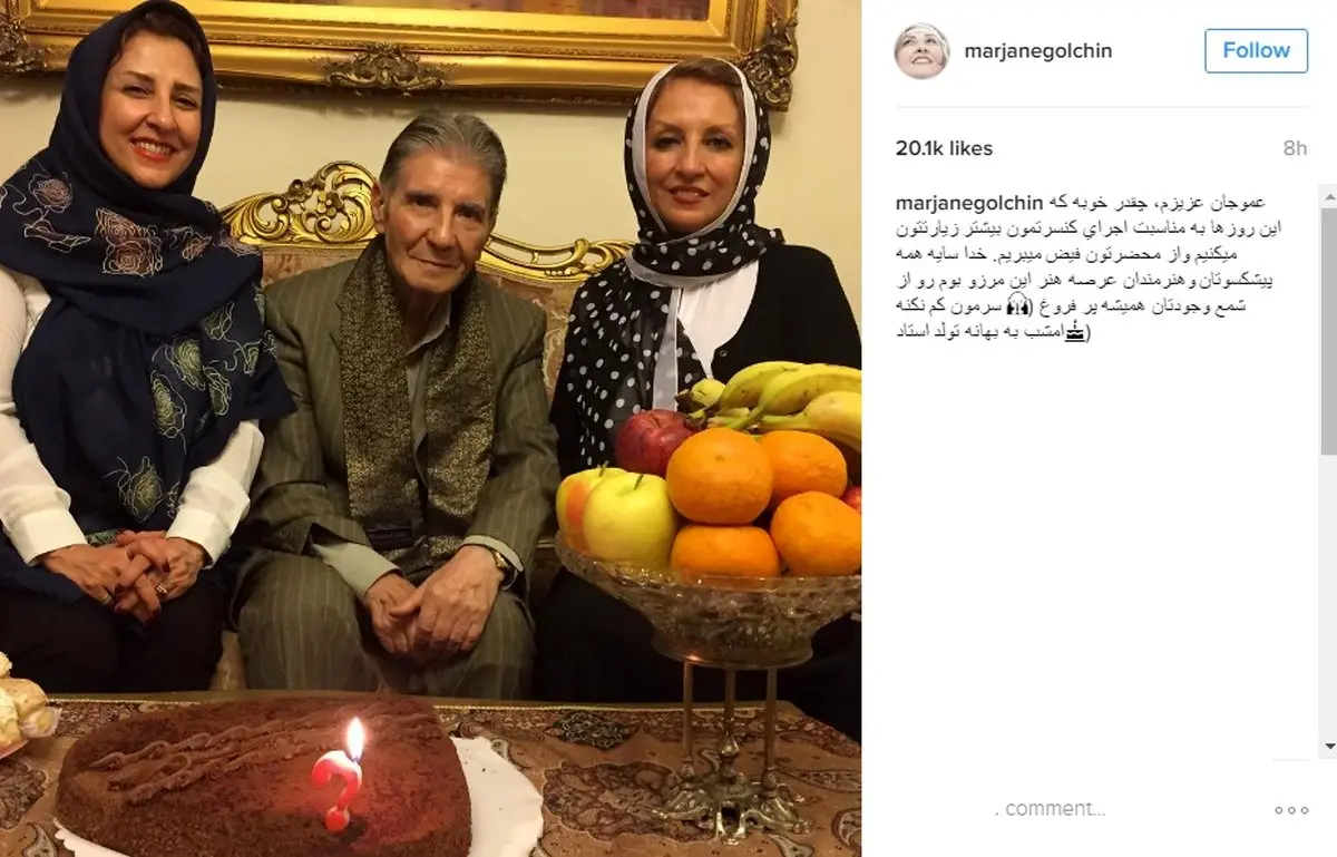 او دراین باره نوشت: «عموجان عزیزم، چقدر خوبه که این روزها به مناسبت اجرای کنسرتمون بیشتر زیارتتون میکنیم و از محضرتون فیض میبریم. خدا سایه همه پیشکسوتان و هنرمندان عرصه هنر Art این مرز و بوم رو از سرمون کم نکنه شمع وجودتان همیشه پر فروغ (امشب به بهانه تولد استاد).»برای ورود به کانال تلگرام ما کلیک کنید.