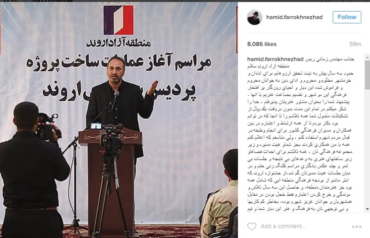 حدود سه سال پیش به نیت تحقق آرزوهایم برای آبادان و خرمشهر مظلوم و محروم و ادای دین به جوانان محروم و فراموششده این دیار و احیای روزگار پرافتخار فرهنگی این دو شهر و تقسیم بضاعت هنریام با آنها، پیشنهاد شما را بهعنوان مشاور هنریتان پذیرفتم. خدا را شکر میکنم در تمام این مدت بدون دریافت یک ریال از تشکیلات متمول شما همه تلاشم را تا آنجا که در توانم بود بهکار بردم تا از همه ارتباط و اعتبارم در بین همکاران و مدیران فرهنگی کشور برای انجام وظیفه در قبال مردم شهرم استفاده کنم، ولی متاسفم که اعلام کنم همه با من همکاری کردند بهجز شما و هیئتمدیره و زیرمجموعه فرهنگیتان. همه تلاشم برای احداث فضاها و زیرساختهای هنری به وعده بینتیجه و جلسات بیثمر و چند عکس یادگاری مراسم کلنگزنی ختم و در میان جلسات هیئتمدیرهتان گم شد. از جشنواره اروند که ابتر ماند و از بودجه فرهنگی منطقهای که شامل همه بود جز هنرمندان منطقه، و حاصل این سه سال تلاش و دوندگی و خرج کردن اعتبارم فقط خجل بودن در مقابل همشهریان و جوانان عزیز شهرم بوده. بهخاطر کمکاریها و بیتوجهیتان به فرهنگ و هنر Art این دیار، شما و تیمتان را نمیبخشم که یادتان باشد میتوانستید و نکردید.