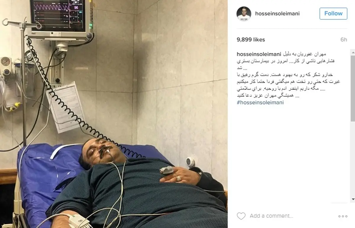 او در توضیح عکس نوشت: «مهران غفوریان به دلیل فشارهایى ناشی از کار... امروز در بیمارستان بستری شد ...