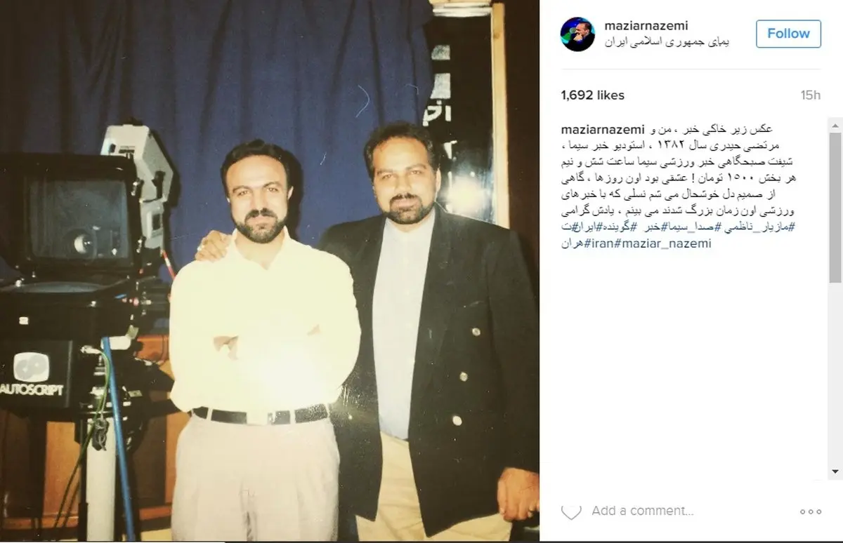 مازیار ناظمی مجری سابق اخبار ورزشی تلویزیون عکسی قدیمی از خود در کنار مرتضی حیدری مجری برنامههای سیاسی و اقتصادی تلویزیون را در اینستاگرام خود منتشر کرد.