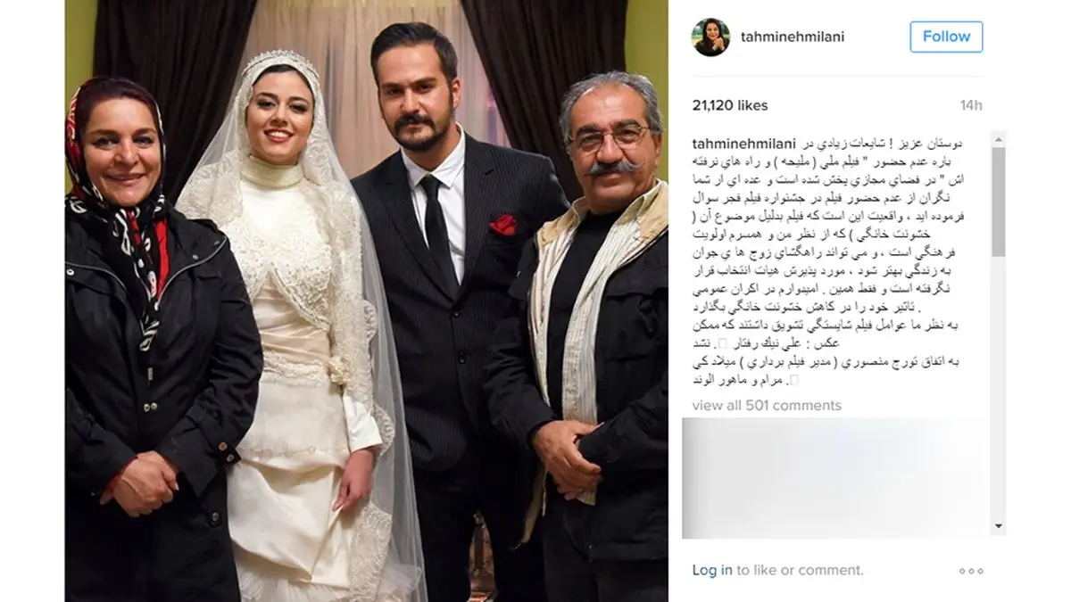 رکنا: تهمینه میلانی با انتشاری عکسی در اینستاگرام به رد شدن فیلمش در جشنواره فجر واکنش نشان داد.