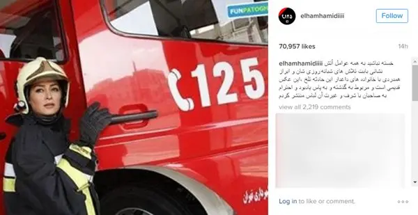 رکنا: الهام حمیدی در پی حادثه دلخراش و جانسوز ساختمان پلاسکو در اینستاگرام خود برای احترام به آتش نشانان فداکار عکسی با لباس آتش نشانی منتشر کرد.