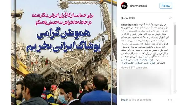 الهام حمیدی در این پست نوشت: هر روز میریم جلو ابعاد گسترده تری از این حادثه Incident کشف و نمایان میشه ، در اخبار و به نقل از ، مدیر عامل تامین اجتماعی شنیدم حدود ۱۵۰۰ میلیارد تومان سرمایه شامل جنس و لباس و کارگاه در این اتفاق از بین رفته و ۳۵۰۰ نفر مستقیم و غیر مستقیم بیکار شده اند و طرح جالبی داشت مبنی بر حمایت کارگران بیکار شده و تولیدی های متضرر شده ، پس از همه می خوام به کمپین حمایت و خرید از تولیدات و البسه ملی و داخلی بپیوندند و به جهت رونق این صنف و کار افرینی این عزیزان که شب عید بیکار و متضرر شده اند باعث دلگرمی تولید ملی و حامی این طرح ملی بشوندبرای ورود به کانال تلگرام ما کلیک کنید.