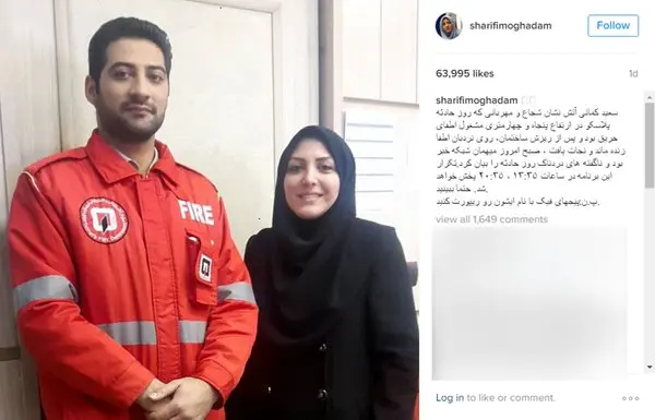 او در توضیح عکس نوشت: «سعید کمانی آتش نشان شجاع و مهربانی که روز حادثه Incident پلاسکو در ارتفاع پنجاه و چهارمتری مشغول اطفای حریق بود و پس از ریزش ساختمان، روی نردبان اطفا زنده ماند و نجات یافت ، صبح امروز میهمان شبکه خبر بود و ناگفته های دردناک روز حادثه را بیان کرد.تکرار این برنامه در ساعات ۱۳:۳۵، ۲۰:۳۵ پخش خواهد شد. حتما ببینید.»برای ورود به کانال تلگرام ما کلیک کنید.