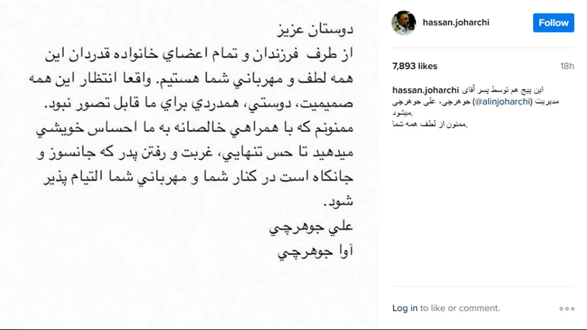 در تازه ترین پست اینستاگرامی حسن جوهرچی خبر داده شده که صفحه اینستاگرام این هنرمند توسط پسر آقای جوهرچی، علی جوهرچی مدیریت می شود و در ادامه آمده: