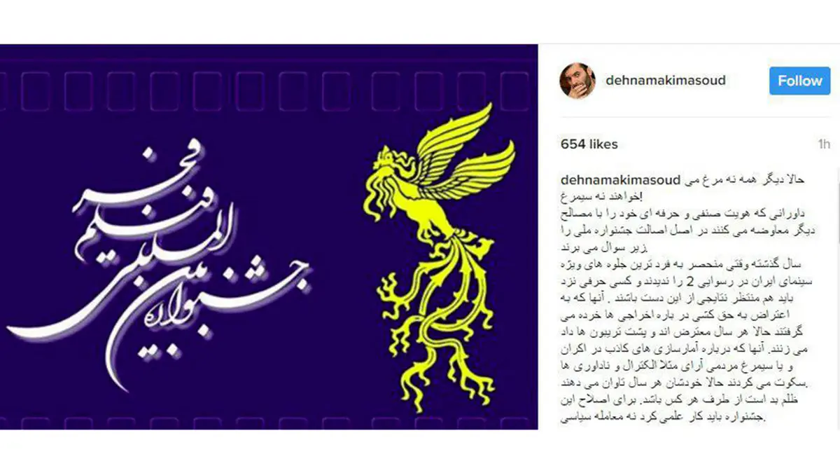 رکنا: مسعود دهنمکی کارگردان کشورمان در صفحه شخصی اش در جواب اعتراض هنرمندان به داوریهای سی و پنجمین دوره فیلم فجر نوشت: حالا دیگر همه نه مرغ می خواهند نه سیمرغ!