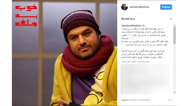 رکنا: سام درخشانی در آخرین پست اینستاگرام مردم را دعوت به تماشای فیلم خوب بد جلف کرد.