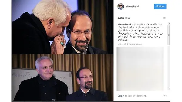 علی معلم در این پست نوشته: «دیشب با اصغر خان فرهادی در جشن خیریه دوستداران فرزندان آسمان گفتم امیدوارم مثل جشنواره کن دوشنبه صبح شاهد دریافت اسکار برای فروشنده و سینمای ایران باشیم.به امید سر بلندی فرهنگ و هنر Art سرزمین مان و موفقیت این فیلمساز برجسته و مهربان ایران»