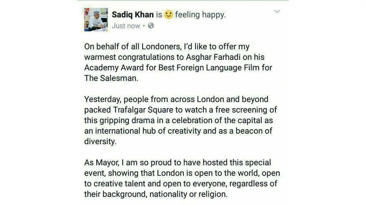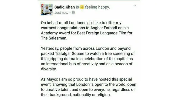رکنا: صادقخان، شهردار لندن در توییتر خود به اصغر فرهادی تبریک گفت و نوشت: صمیمانهترین تبریکم را به اصغر فرهادی، به خاطر دریافت اسکار بهترین فیلم خارجی تقدیم میکنم.