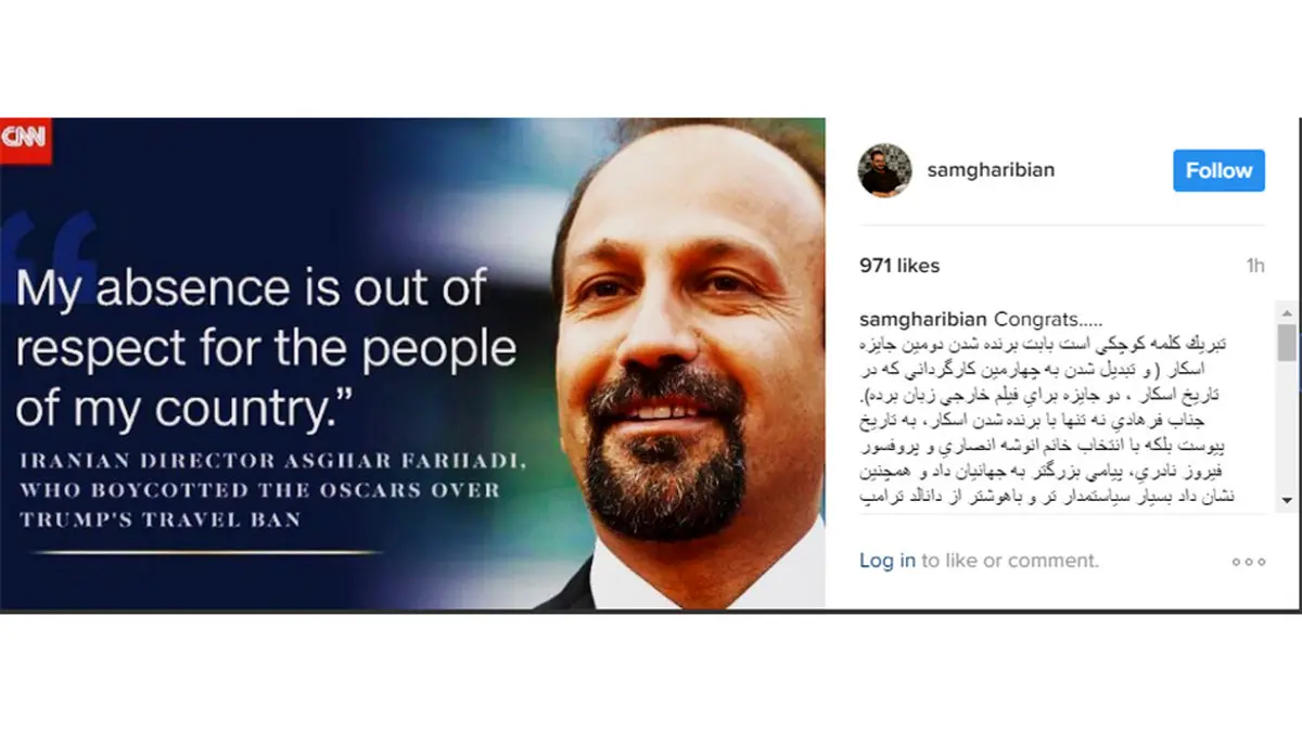 وی در توضیح این پست نوشت: تبریک کلمه کوچکی است بابت برنده شدن دومین جایزه اسکار ( و تبدیل شدن به چهارمین کارگردانی که در تاریخ اسکار ، دو جایزه برای فیلم خارجی زبان برده). جناب فرهادی نه تنها با برنده شدن اسکار، به تاریخ پیوست بلکه با انتخاب خانم انوشه انصاری و پروفسور فیروز نادری، پیامی بزرگتر به جهانیان داد و همچنین نشان داد بسیار سیاستمدارتر و باهوشتر از دانالد ترامپ Trump است.....دست مریزاد.برای ورود به کانال تلگرام ما کلیک کنید.