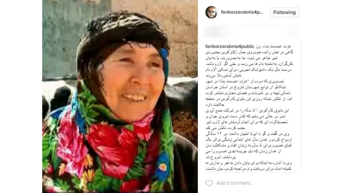فریبرز عرب نیا بازیگر Actor سینما Cinema و تلویزیون با انتشار پستی در صفحه اینستاگرامش از ویژگی های زن کارآفرین بجنوردی و سختی های کار او گفت و عنوان کرد:تصاویری که مردم از ‘عزت عصمت پناه’ در شهر تیتکانلو از توابع شهرستان فاروج در استان خراسان شمالی تهیه و در نشریات و فضای مجازی منتشر کرده اند، از تلاش شبانه روزی این بانوی کارآفرین در منطقه حکایت دارد.