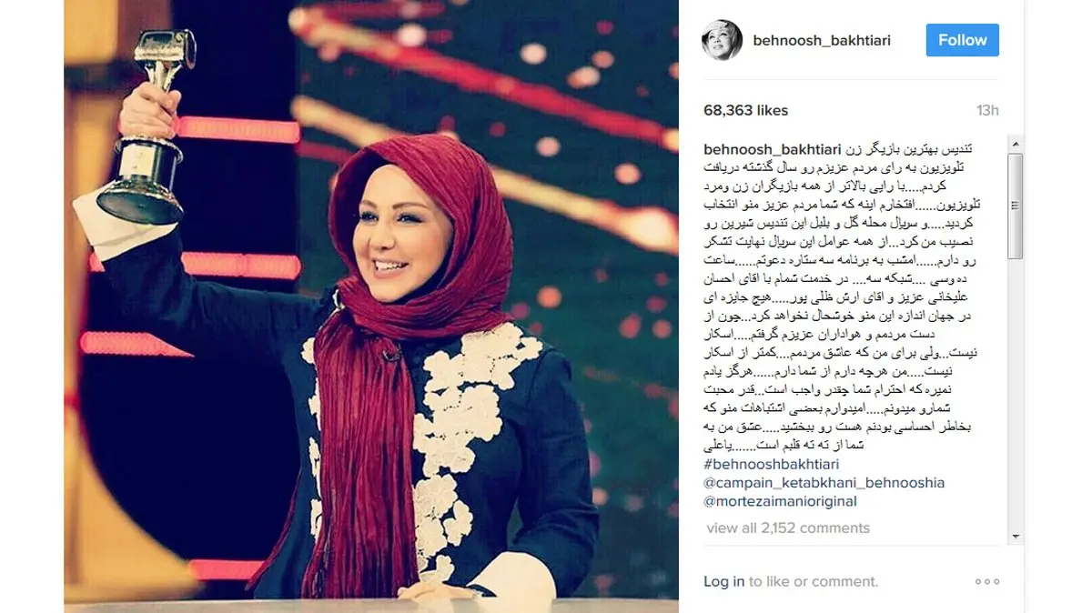 تندیس بهترین بازیگر Actor زن تلویزیون به رای مردم عزیزم رو سال گذشته دریافت کردم.....با رایی بالاتر از همه بازیگران زن ومرد تلویزیون......افتخارم اینه که شما مردم عزیز منو انتخاب کردید.....و سریال محله گل و بلبل این تندیس شیرین رو نصیب من کرد...از همه عوامل این سریال نهایت تشکر رو دارم......امشب به برنامه سه ستاره دعوتم......ساعت ده وسی ....شبکه سه.... در خدمت شمام با اقای احسان علیخانی عزیز و اقای ارش ظلی پور.....هیچ جایزه ای در جهان اندازه این منو خوشحال نخواهد کرد...چون از دست مردمم و هواداران عزیزم گرفتم.....اسکار نیست...ولی برای من که عاشق مردمم....کمتر از اسکار نیست.....من هرچه دارم از شما دارم......هرگز یادم نمیره که احترام شما چقدر واجب است...قدر محبت شمارو میدونم.....امیدوارم بعضی اشتباهات منو که بخاطر احساسی بودنم هست رو ببخشید.....عشق من به شما از ته ته قلبم است.......یاعلی. برای ورود به کانال تلگرام ما کلیک کنید.