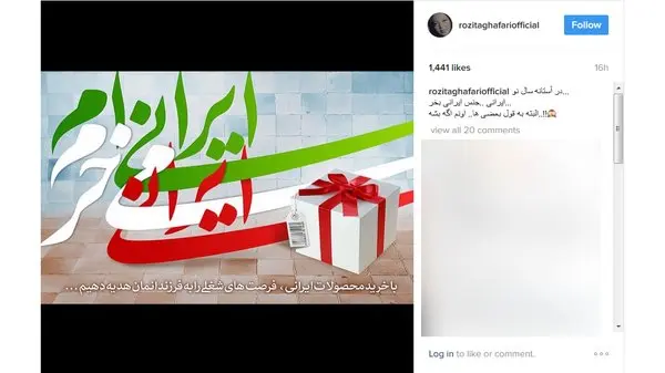 رکنا: رزیتا غفاری در انتشار پستی در اینستاگرام به حمایت از تولیدات داخلی پرداخت.