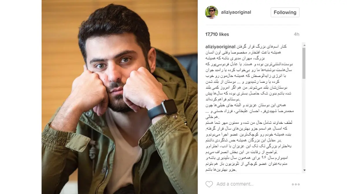 «کنار اسمهای بزرگ قرار گرفتن همیشه باعث افتخاره. مخصوصا وقتی اون انسان بزرگ، مهران مدیری باشه که همیشه دوستداشتنیترین بوده و هست. یا عادل فردوسیپور که سالهاست دوشنبهها ما رو بیخواب کرده یا رامبد جوان با انرژی زایدالوصفش که همیشه حالمون رو خوب کرده یا رضا رشیدپور و ... دوستان از بلند شدن دوستانشان بلند میشوند. من هم اگر امروز کمی بلند شده باشم بدون شک حاصل بستری بوده که سالها پیش دوستانم فراهم کردهاند.