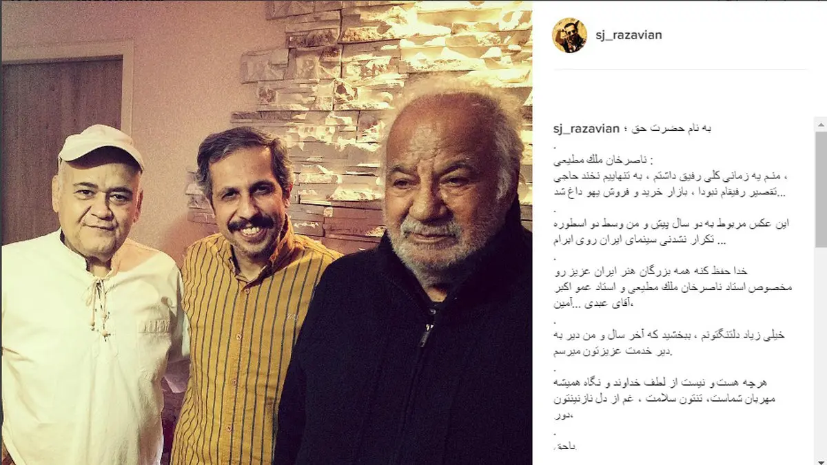 رکنا: جواد رضویان با انتشار عکسی از خود را در کنار ناصر ملکمطیعی و اکبر عبدی، این دو بازیگر را اسطورههای سینمای ایران نامید.